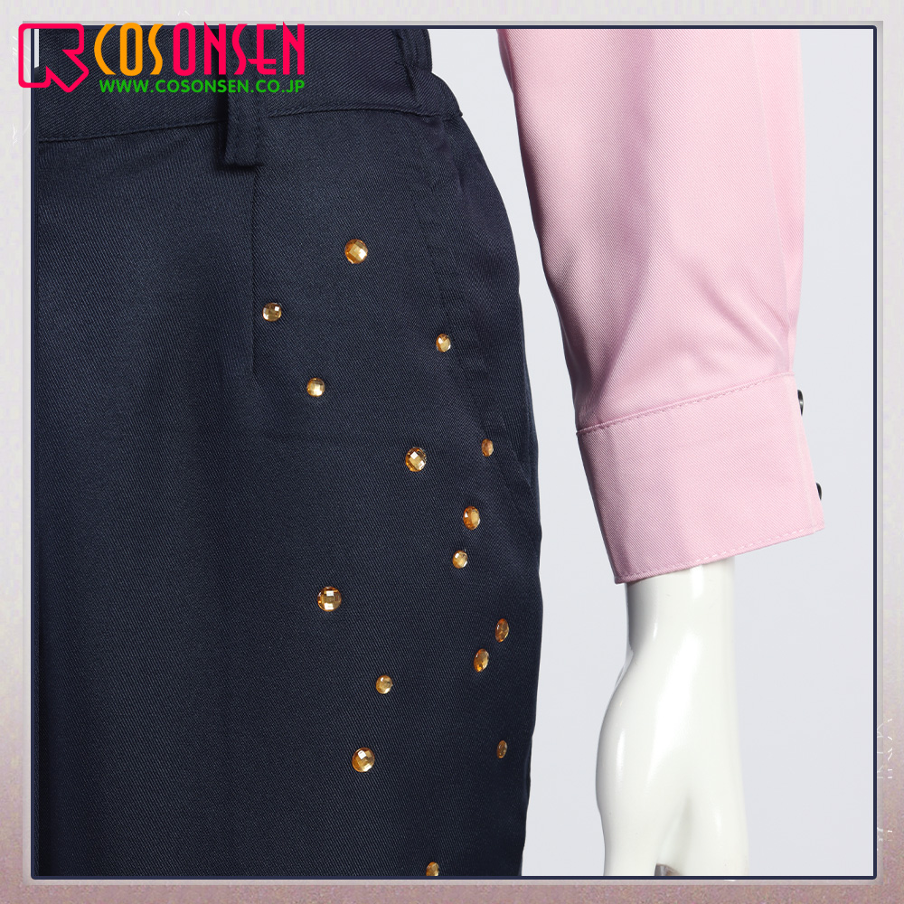 ポリエステルツイルで製作しています。両側にポケットが施されています。ジャケットと同じの宝石のような飾り物が付きます。