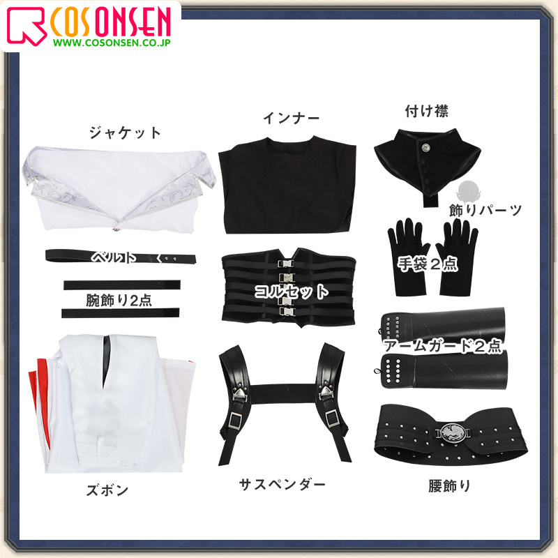 ジャケット、インナー、ズボン、飾り物(付け襟、飾りパーツ、サスペンダー、コルセットベルト、腰飾り、ベルト、アームガード2点、腕飾り2点、手袋2点、)