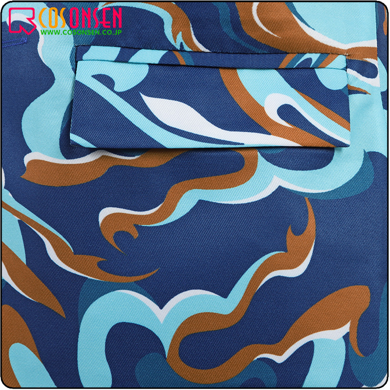 ポリエステルツイルで制作しています。襟はVネックのデザインで、両サイドにポケットが施されています。全体的に特徴的な花柄がプリントされて、華やかに見せています。