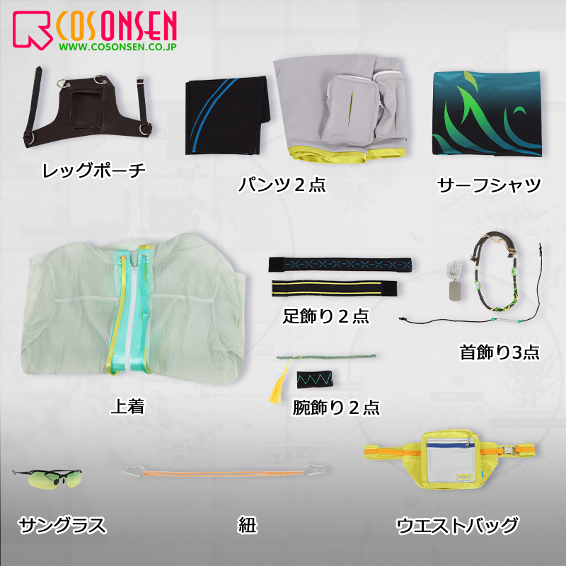 上着、サーフシャツ、パンツ2点、飾り物(サングラス、首飾り3点、腕飾り2点、ウエストバッグ、レッグポーチ、足飾り2点、紐)