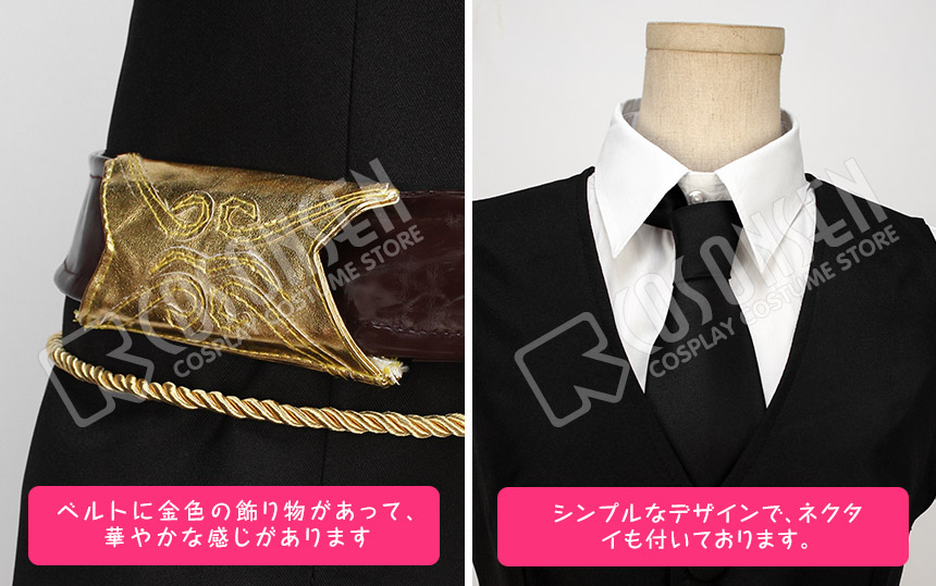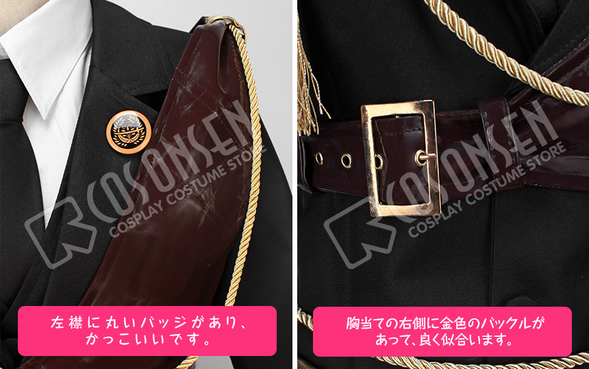 黒を基調したポリ混紡生地にて製作します。腰にはベルトが付きます。左胸に合皮製の胸当てが飾り、恰好いいイメージが伝わってきました。裾に綺麗な柄がプリントされており、見事に原作を再現しました。