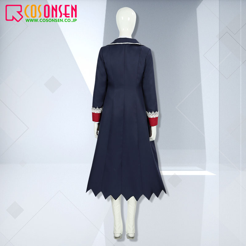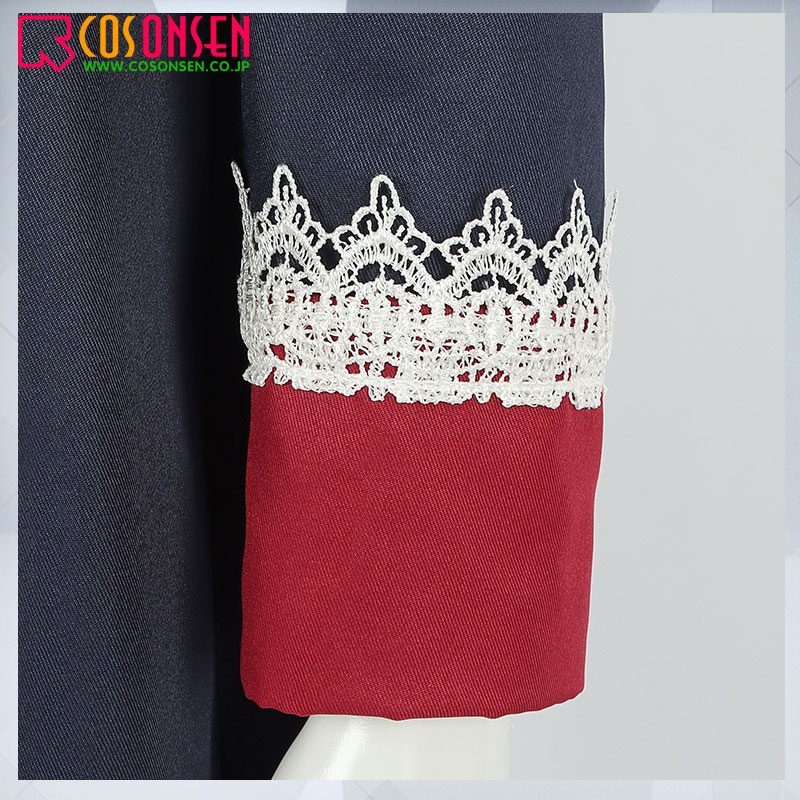 ポリエステルツイルで制作しています。ネイビーを基調として、赤い袖口に白いレースが飾っており、印象的です。ジグザグ形状の裾はポイントです。