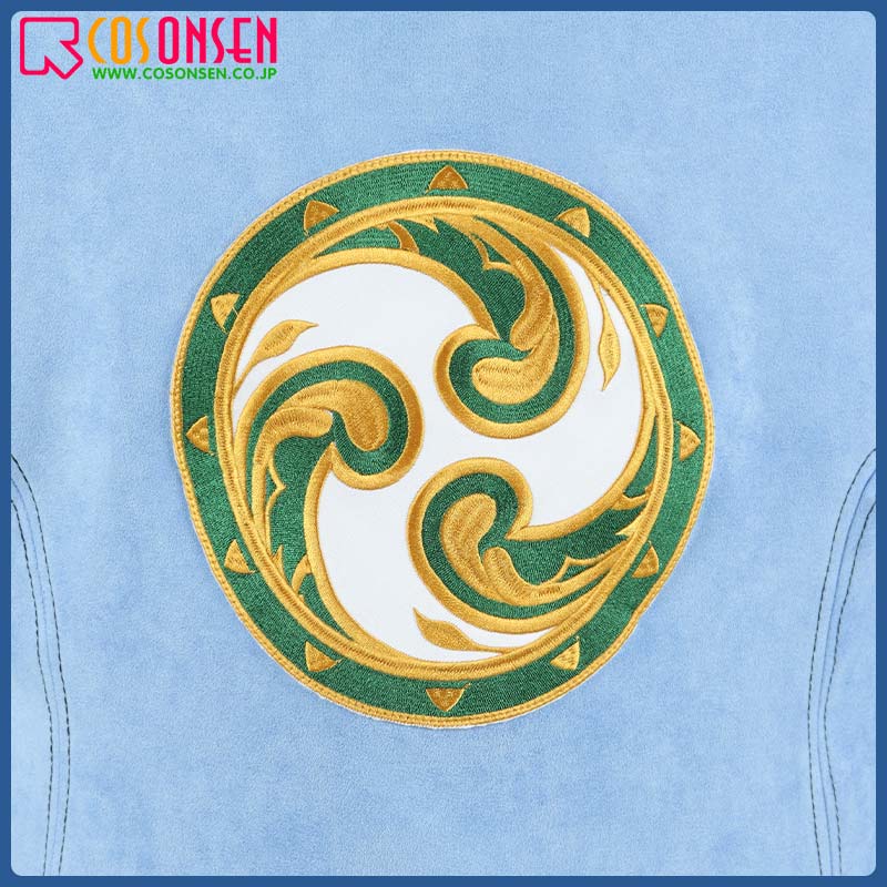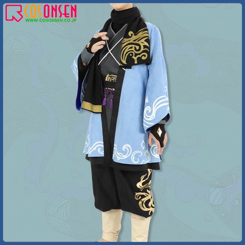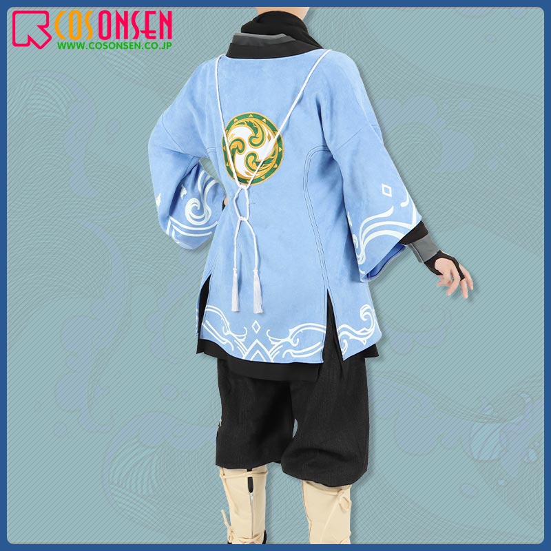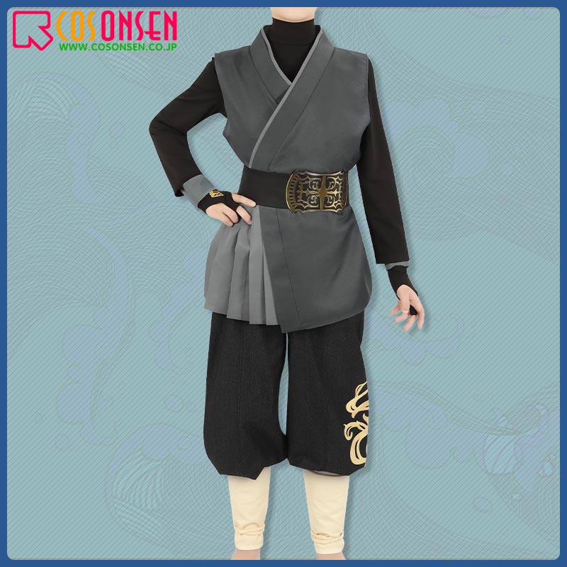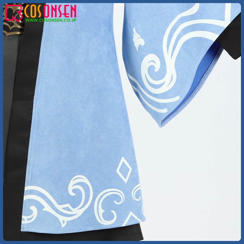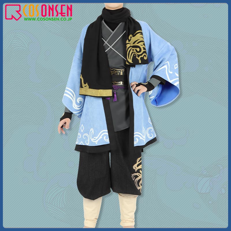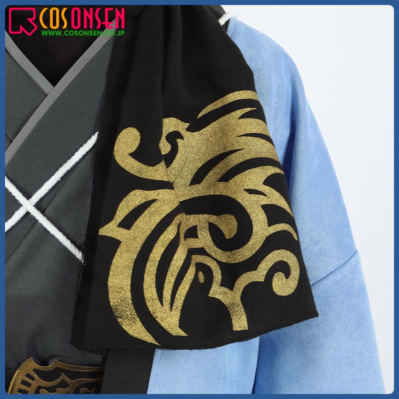 スエード生地で制作しています。柔らかな手触りで着心地は抜群です。袖口と裾に個性的な模様が綺麗にプリントされて、原作を忠実に再現するように心掛けています。後ろの特徴的な柄は刺繍でとても上品に見えます。