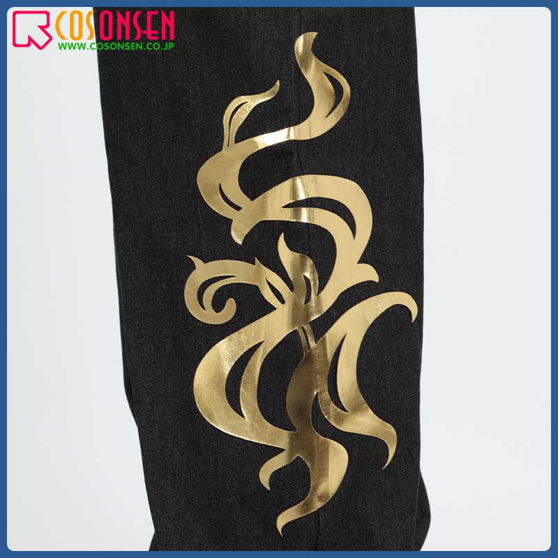 デニムで制作しています。オーダーサイズで動きやすいです。左サイドに金色の合皮が貼り付けられて、かっこいい印象を与えます。