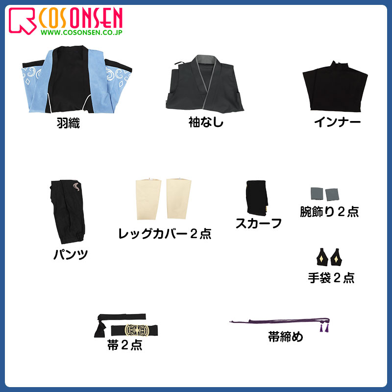 羽織、袖なし、インナー、パンツ、飾り物(スカーフ、腕飾り2点、手袋2点、帯2点、帯締め、レッグカバー2点)