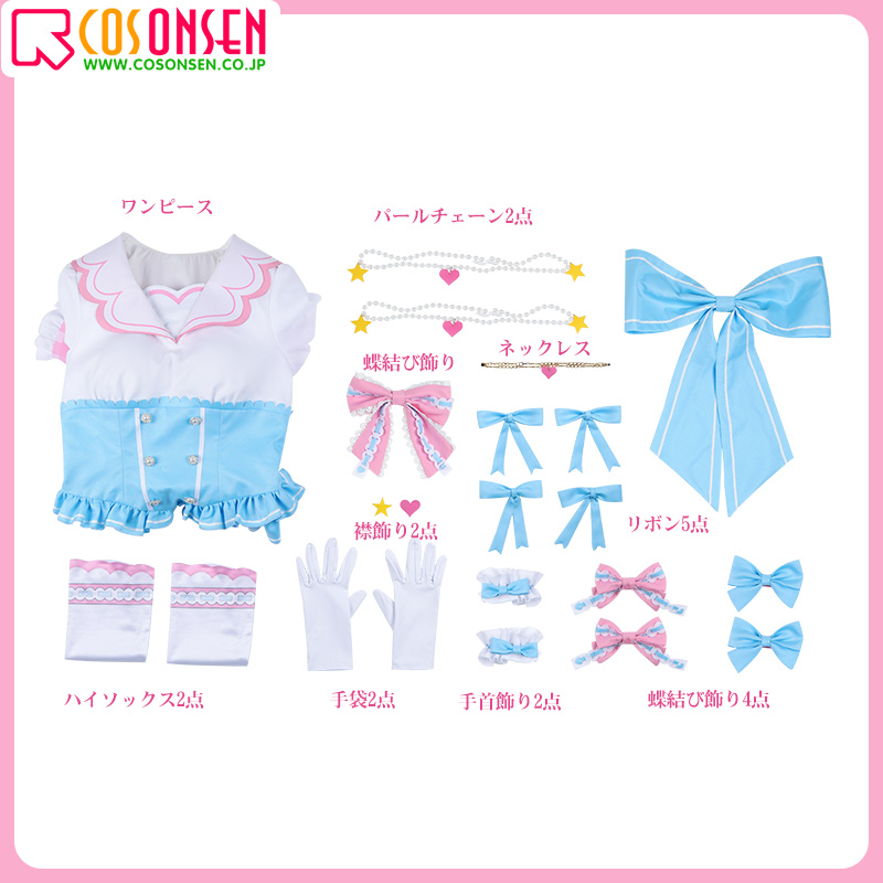ワンピース、飾り物(蝶結び飾り4点、ハイソックス2点、手首飾り2点、手袋2点、リボン6点、襟飾り、ネックレス、パールチェーン2点、)