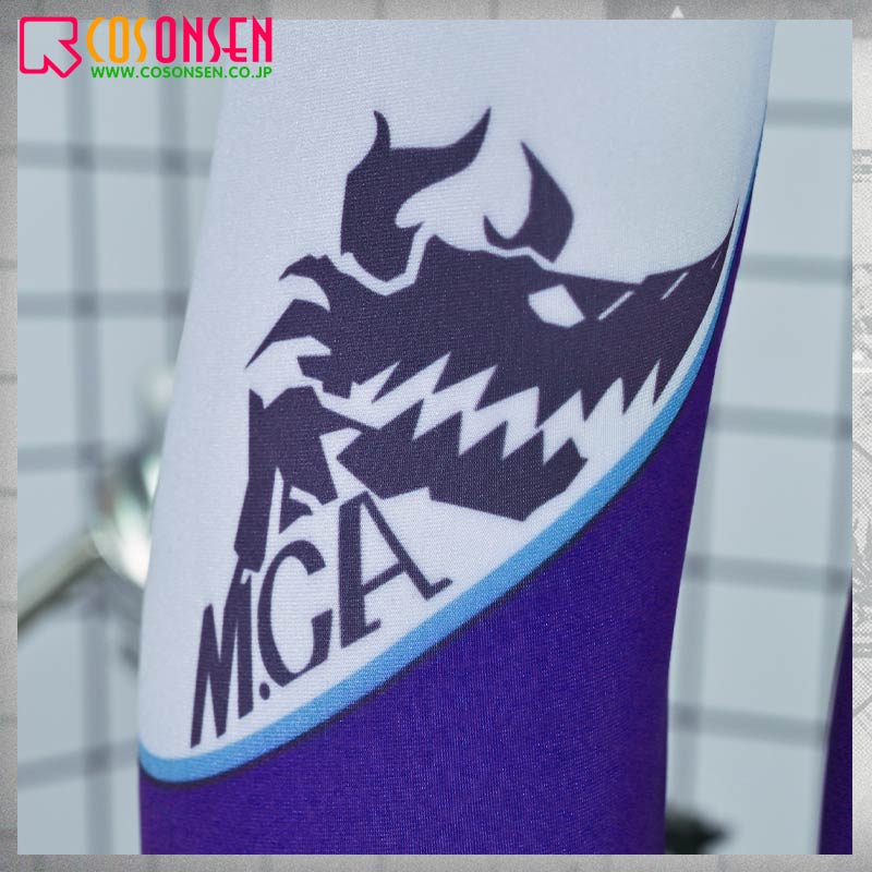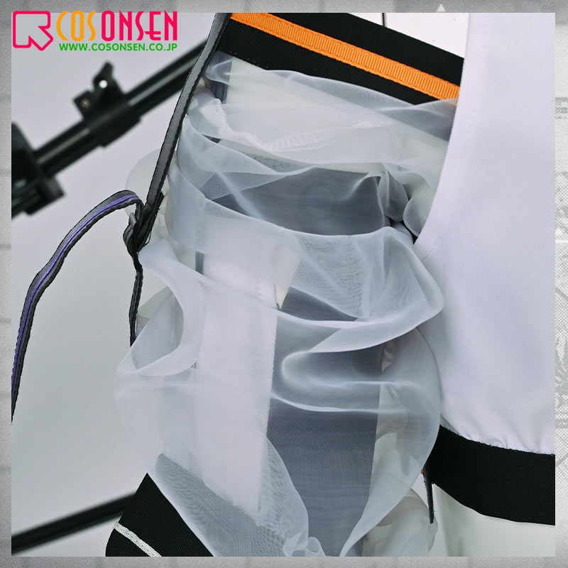 ポリエステルギャバで製作しています。白色とオレンジ色を基調として、胸先にベルトを飾り、原作を再現します。