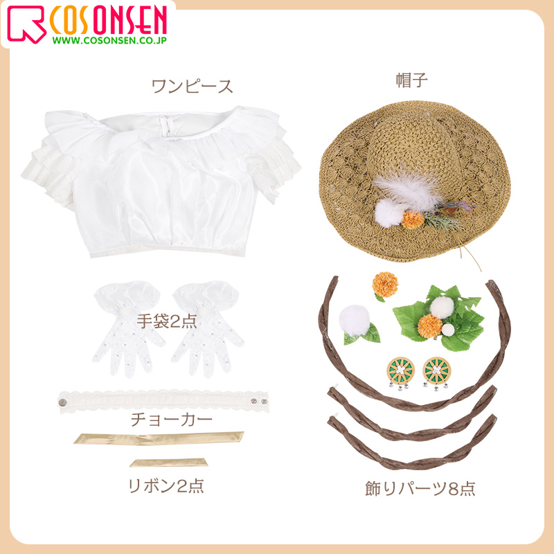 ワンピース、飾り物(帽子、チョーカー、飾りパーツ8点、リボン2点、手袋2点)