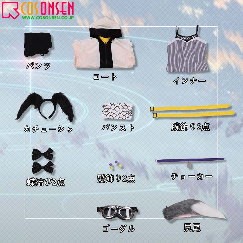 コート、インナー、パンツ、飾り物(パンスト、尻尾、腕飾り2点、チョーカー、カチューシャ、髪飾り2点、ゴーグル、蝶結び2点)