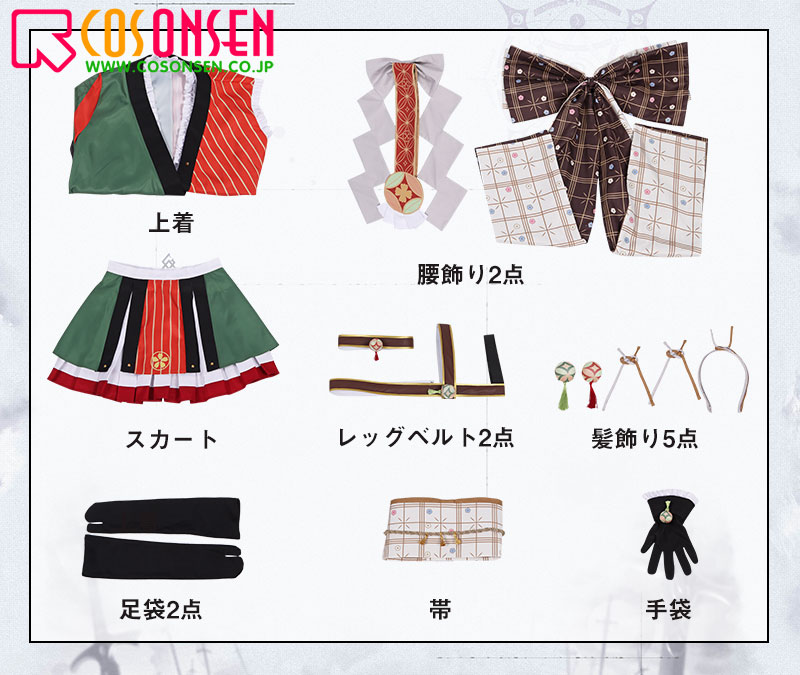 上着、スカート、飾り物(髪飾り5点、帯、腰飾り2点、手袋、レッグベルト2点、足袋2点)