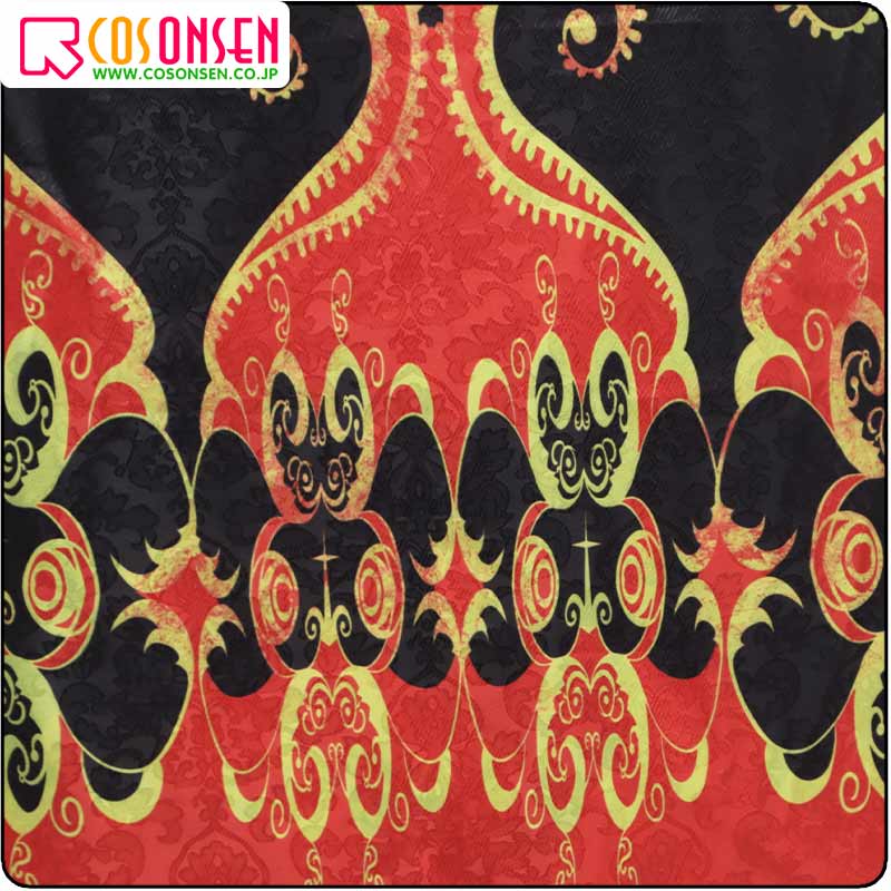 ジャガード生地で制作しています。ジャガード生地に特殊な柄をプリントして、細部までこだわって仕上がっています。襟に金色の縁取りが施されて、とても上品に見えます。