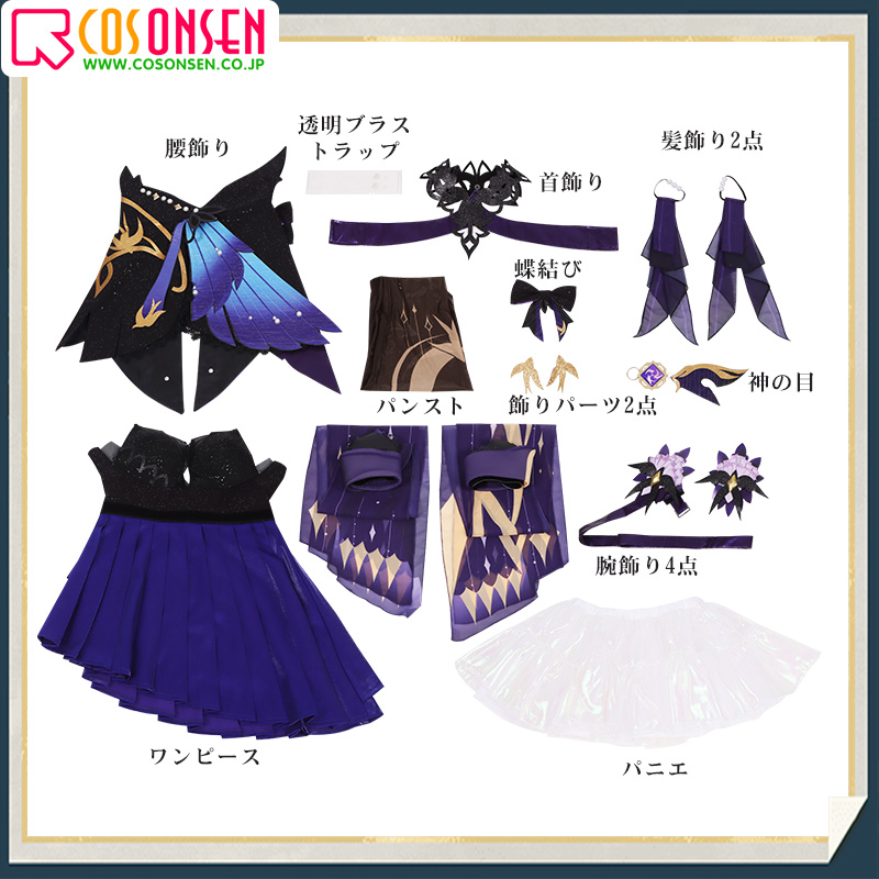 ワンピース、パニエ、飾り物(髪飾り2点、首飾り、透明ブラストラップ、腕飾り4点、腰飾り、パンスト、飾りパーツ2点、神の目)