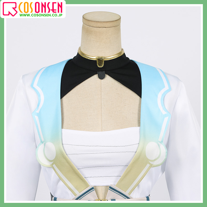 ポリエステルギャバで制作しています。全体に白を基調として、襟元には原作に忠実な絵柄が綺麗にプリントされてグラデーションのデザインです。自然な肩のラインは全体的な綺麗なシルエットと着心地の良さを実現されています。