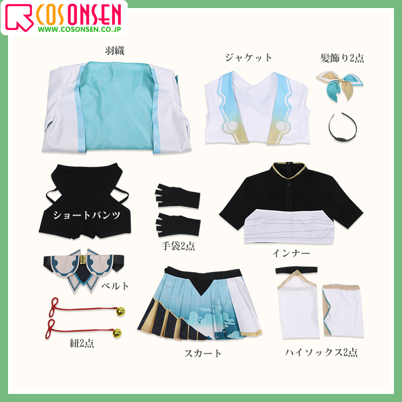 羽織、ジャケット、インナー、スカート、ショートパンツ、飾り物(ベルト、ハイソックス2点、髪飾り2点、手袋2点、紐2点)