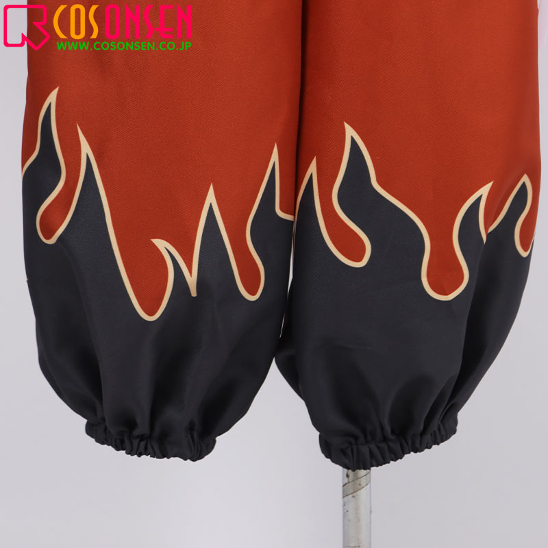 ポリエステルツイルで製作しています。襟に金色の炎の紋様が飾ってあり、両袖は七分袖で、原作を再現しました。