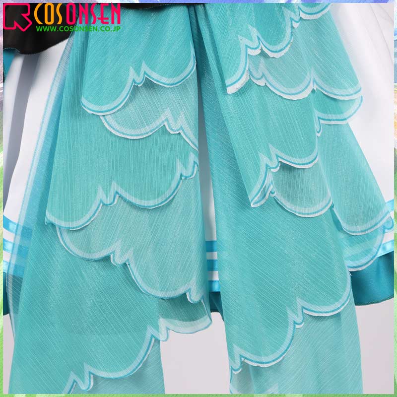 主にポリエステルギャバで製作しています。原作通りの造りとなっているため、完成度がとても高いです。青いヒラヒラがかわいいです。
