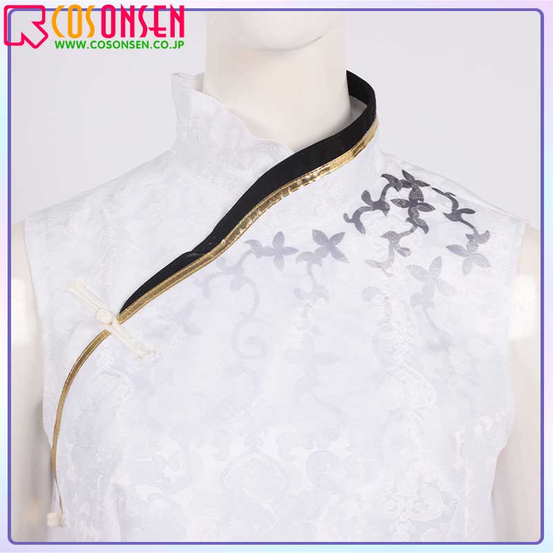 ジャガード生地で製作しています。白を基調として、銀色の花柄をプリントされています。チャイナドレスの立ち襟デザインで、シルエットをきれいに見せます。