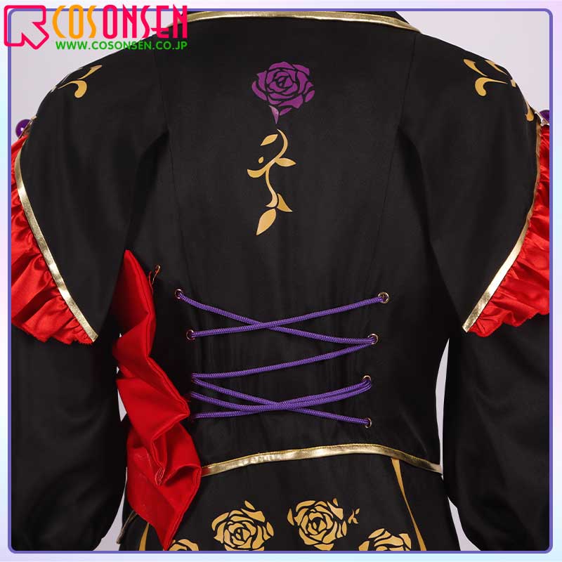 ポリエステルギャバで制作しています。襟は花柄とピンクの宝石を飾っています。肩の赤いラッフルフリルはナイロンシルク生地、腰前に赤いバンドはサテン生地で作られます。裾のユニークなデザインがとてもおしゃれです。後ろの花柄は最大限に原作を再現されます。