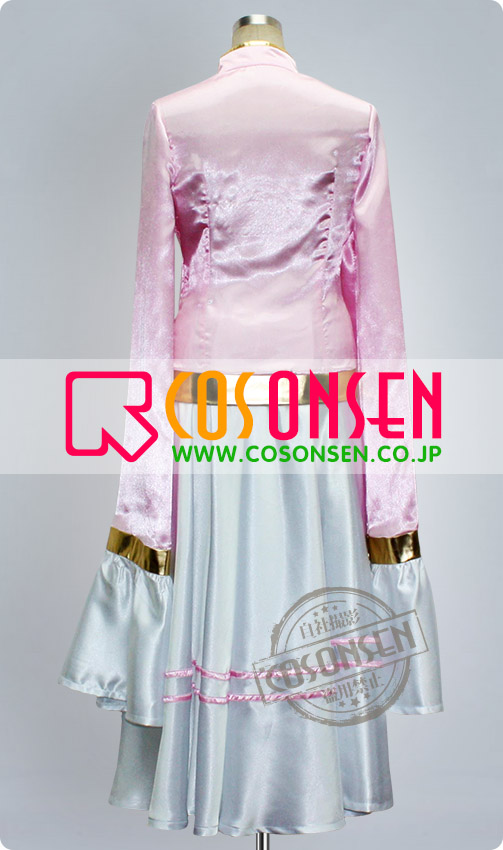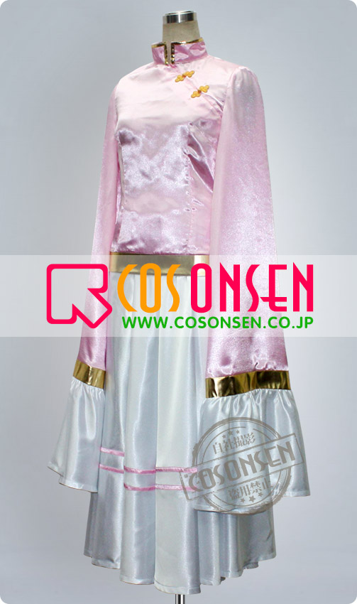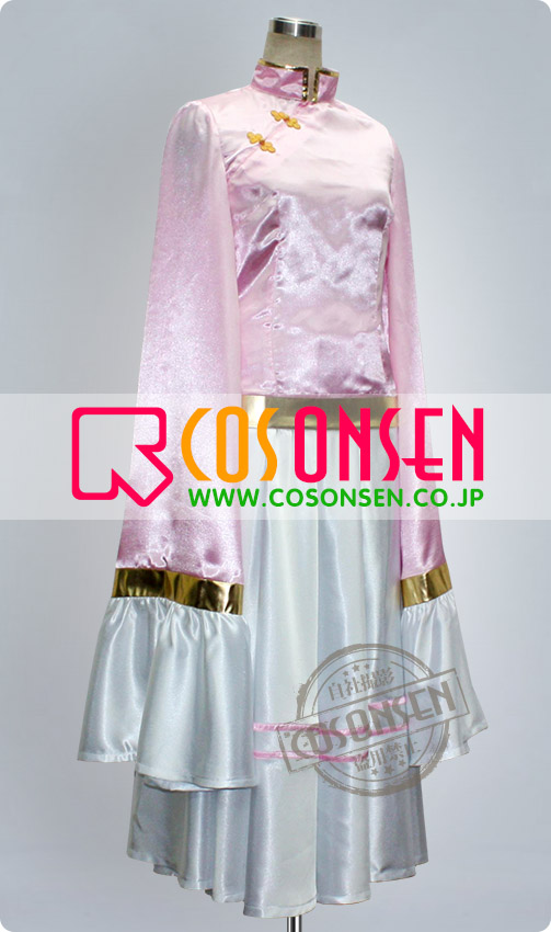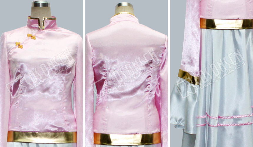 ピンク色と白の組み合わせで、大きな袖と腰に金色の縞模様があります。スカート部分にピンク色の刺繍がされています。