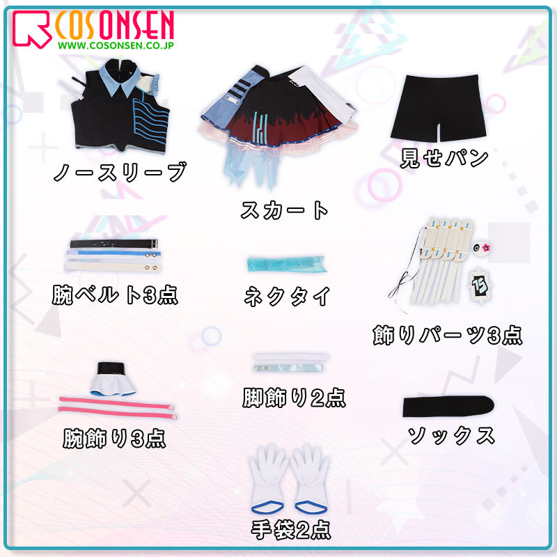 ノースリーブ、スカート、飾り物(ネクタイ、腕飾り3点、腕ベルト3点、手袋2点、飾りパーツ3点、見せパン、脚飾り2点、ソックス)