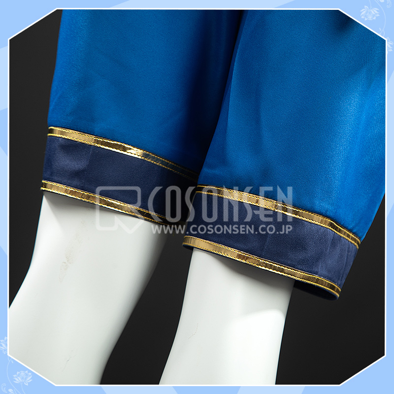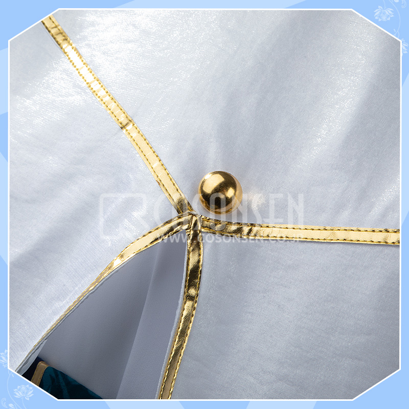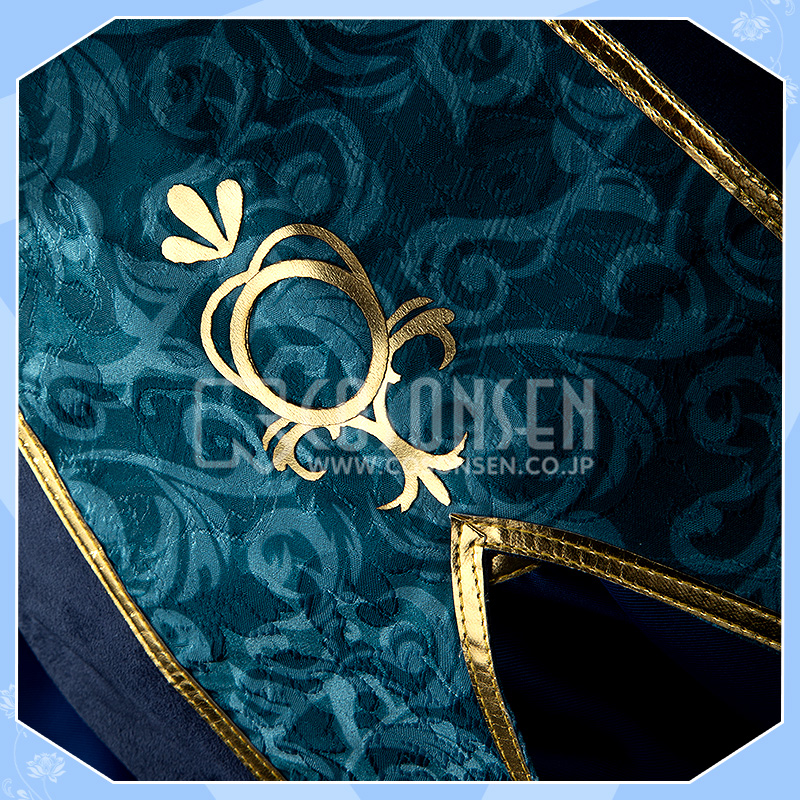 光沢布で製作しています。白とブルーを基調として、光沢感のある素材を使って、襟に金色の柄が施されて高級感満々です。