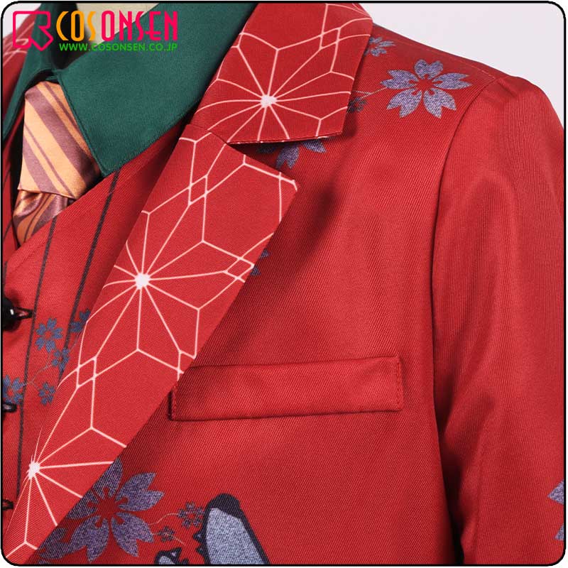 ポリエステルツイルで制作しています。ドレープ性に優れており、衣装を美しく表現しています。赤を基調として、原作に忠実な絵柄が綺麗にプリントされて再現度が高いです。