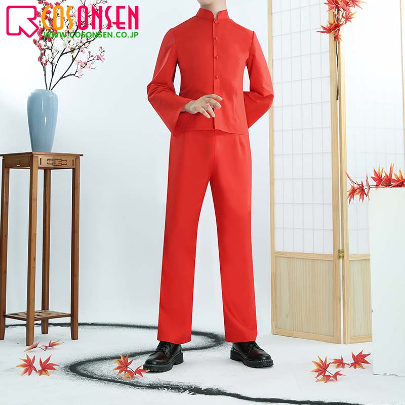 シャツ生地で制作しています。赤を基調として、詰め襟のシャツで、袖口は広くなって運動やすいです。