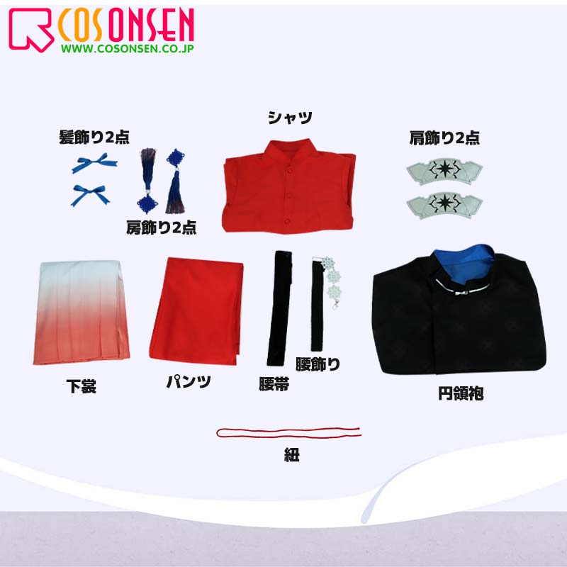 円領袍、シャツ、下裳、パンツ、飾り物(髪飾り2点、肩飾り2点、房飾り2点、腰帯、腰飾り、紐)
