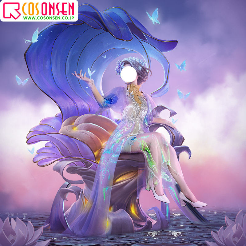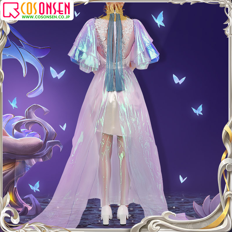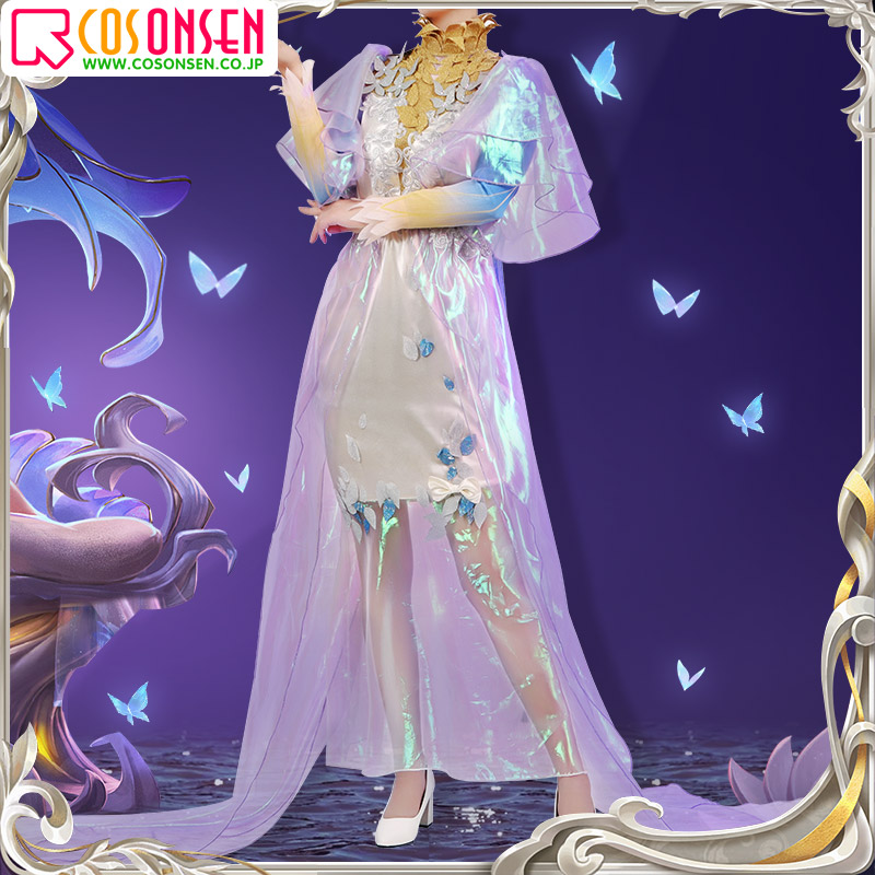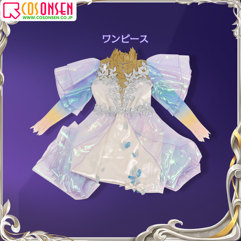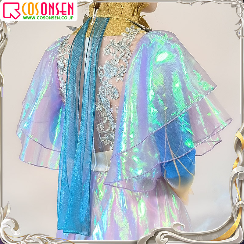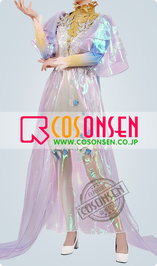 主にオーガンザで制作しています。レーザーのような光沢ある素材を使ったので、夢幻の雰囲気満々です。胸元と腰と後ろに綺麗な刺繍片を縫い付けて、花形の袖口があり、再現度が高いです。