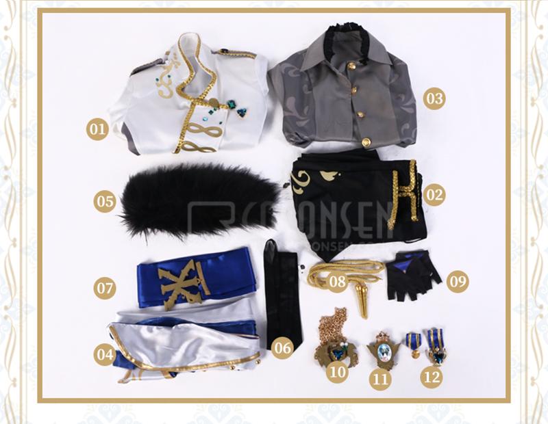 ジャケット、シャツ、パンツ、飾り物(肩掛け2点、ネクタイ、リボン、紐、手袋2点、腰飾り、襟飾り、飾りパーツ2点)