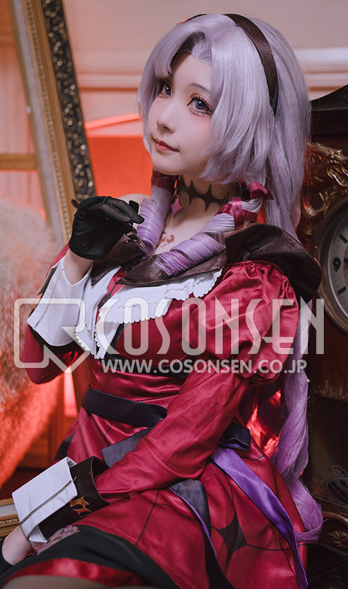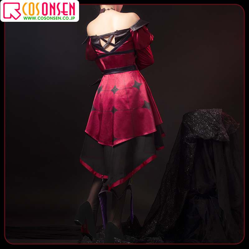人絹で製作しています。ベアトップのデザインで、スカート部分は二層構造で原作を忠実に再現しました。そして、光沢感がある素材を使ったので、高級感満々です。
