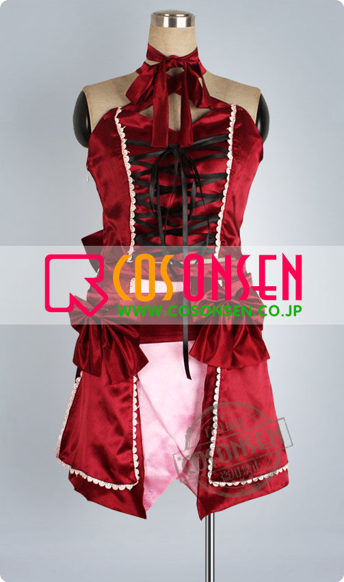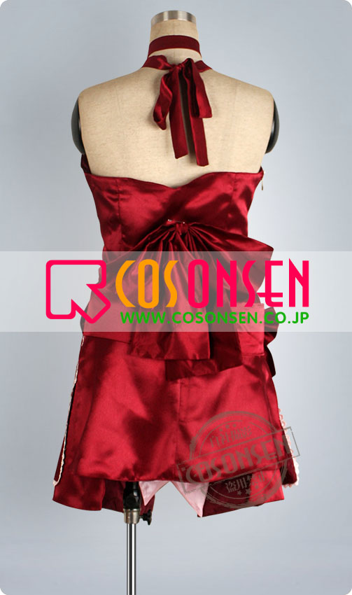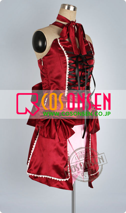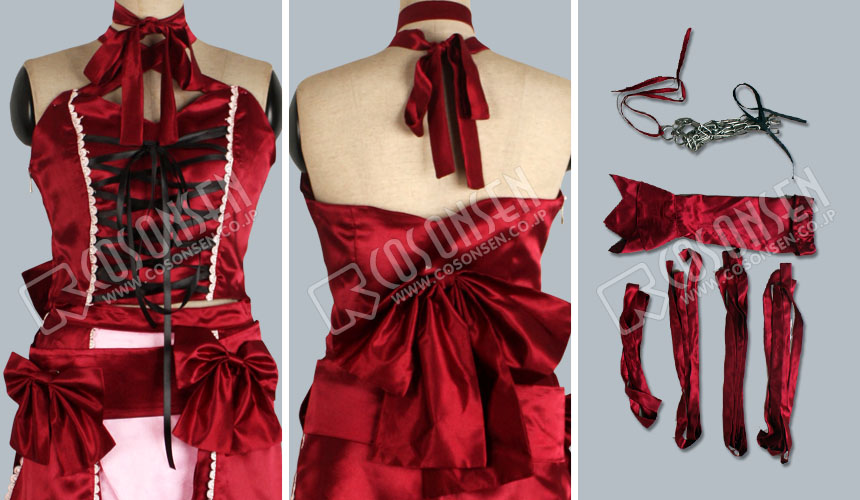 ワイン色を基調にし、黒い紐で締めていて肩と背中を露出します。また背中に大きな赤リボンがあります。