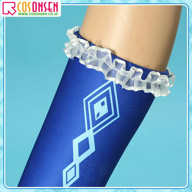 主にポリエステルギャバで製作しています。青を基調として、レイヤー感のあるデザインで、可愛いリボンが飾っており、アイドル風のスカートです。原作を忠実に再現しました。