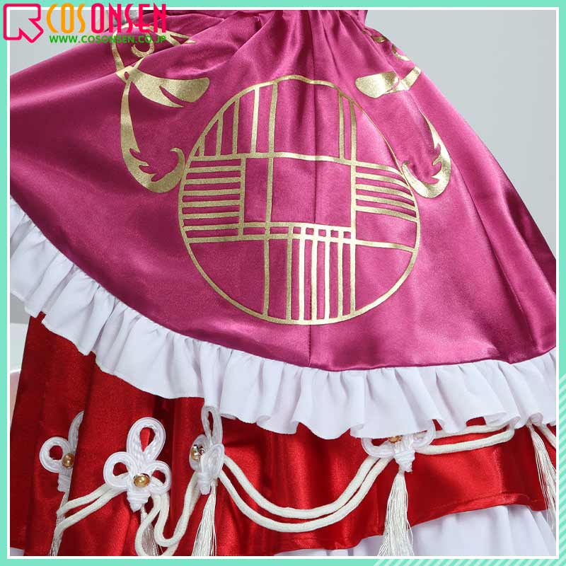 人絹で製作しています。赤を基調をとして、半袖のワンピースです。衣装に多くの唐風飾り物を使って、スカート部分は二層構造でとても可愛いです。