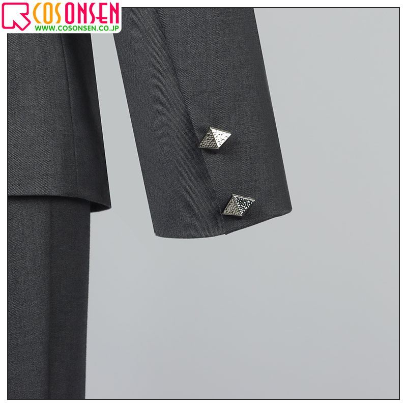 スーツ生地で製作しています。胸先と袖口に菱形のボタンが飾ってあり、再現度が高いです。