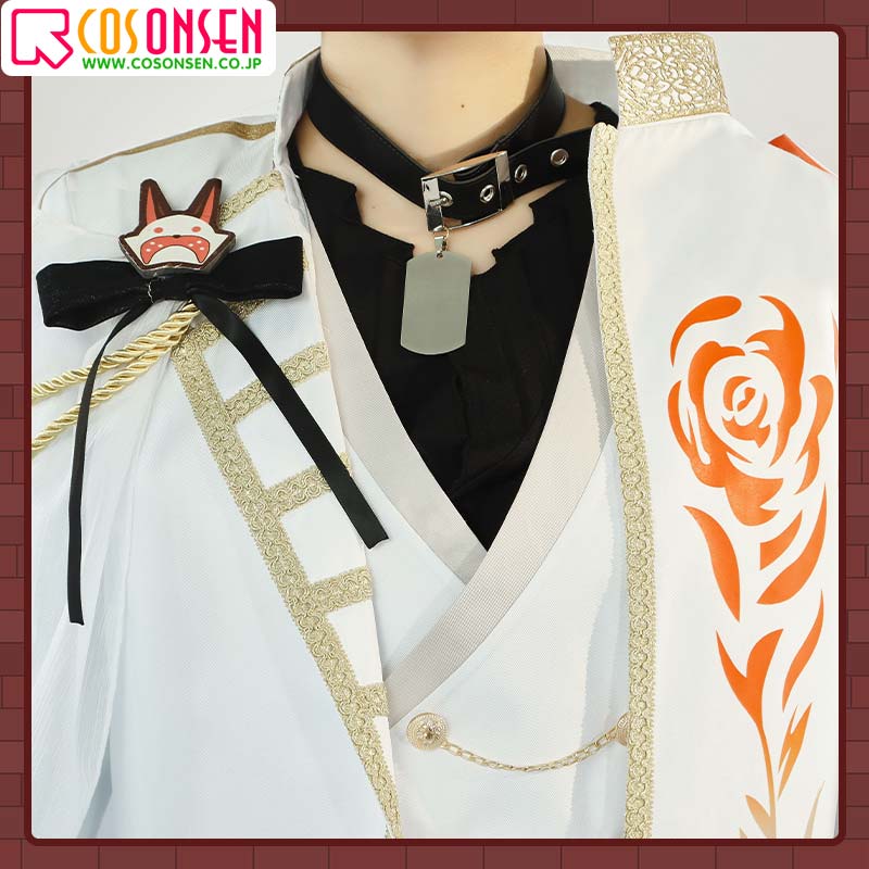 ポリエステルギャバで制作しています。白を基調として、右肩に白い肩掛けが飾ってあり、胸元にオレンジのバラ柄がプリントされて再現度が高いです。