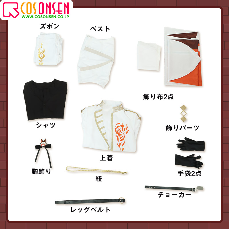 上着、ベスト、シャツ、ズボン、飾り物(チョーカー、胸飾り、飾り布2点、紐、手袋2点、レッグベルト、飾りパーツ)