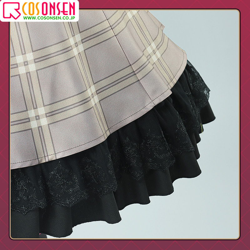 ポリエステルギャバで製作しています。二重プリーツスカートで、裾に黒いレースが飾ってあり、超可愛いです。
