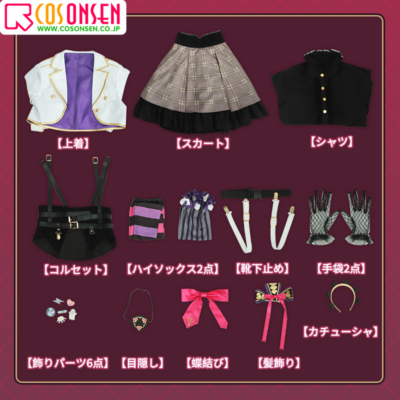 上着、シャツ、スカート、飾り物(カチューシャ、髪飾り、目隠し、蝶結び、コルセット、手袋2点、ハイソックス2点、靴下止め、飾りパーツ6点)