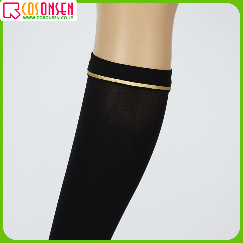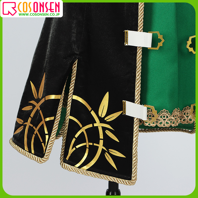 光沢布で製作しています。黒を基調として、裾に竹のような金色柄が飾ってあり、再現度が高いです。