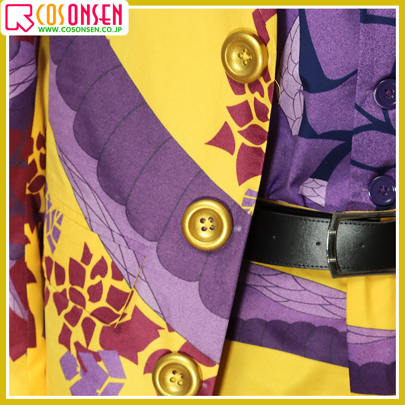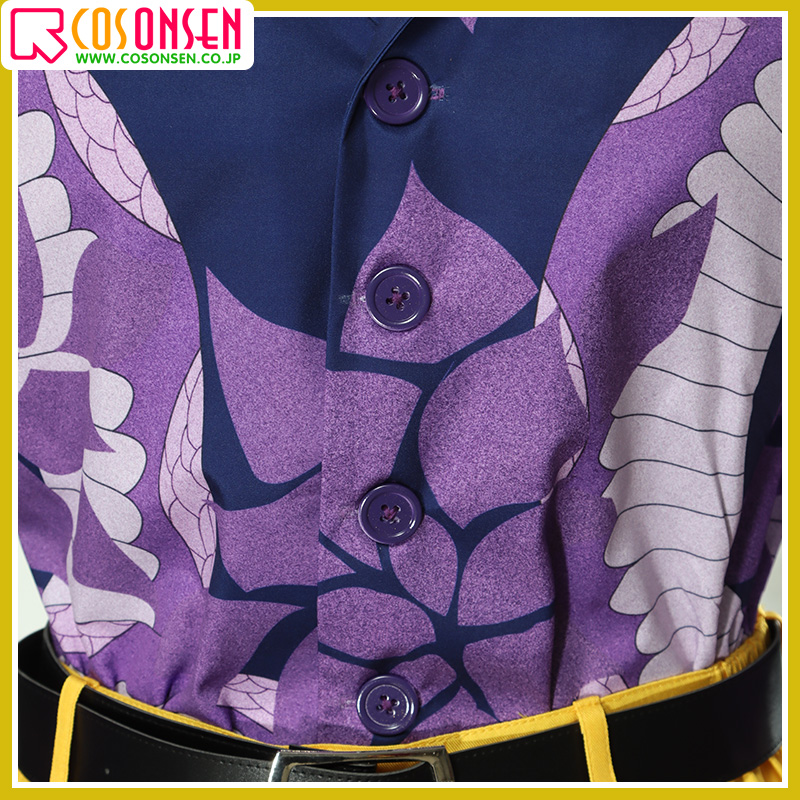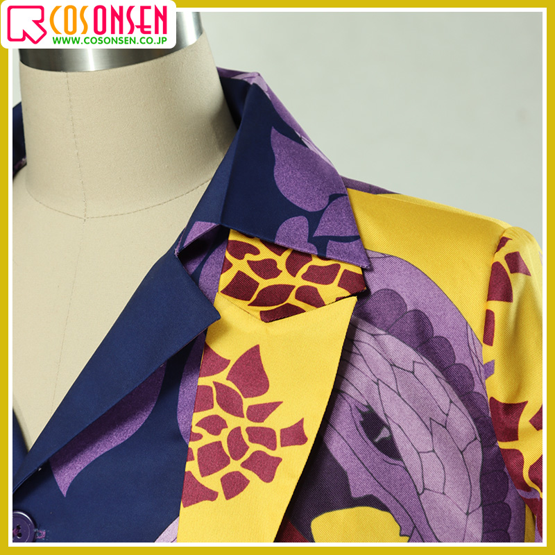 ポリエステルギャバで製作しています。黄色の生地で紫色の蛇と綺麗な花柄がプリントされて、再現度が高いです。