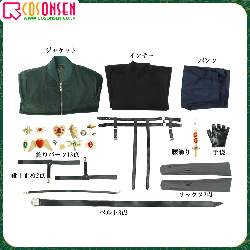 ジャケット、インナー、パンツ、飾り物(ベルト3点、腰飾り、手袋、ソックス2点、靴下止め2点、飾りパーツ13点)