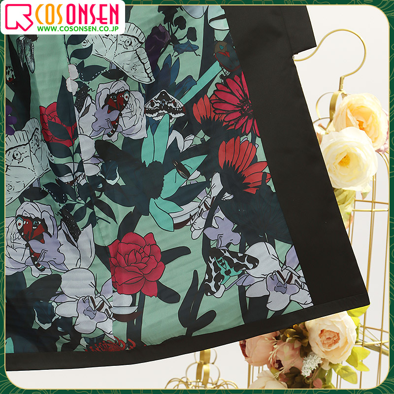 ブライダルサテンで製作しています。黒を基調として、両サイドに本物のポケットが施されています。裏地に綺麗な花の絵柄がプリントされて、再現度が高いです。
