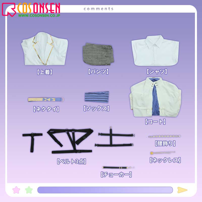 コート、上着、シャツ、パンツ、飾り物(チョーカー、ネックレス、ネクタイ、腰飾り、ベルト3点、ソックス)