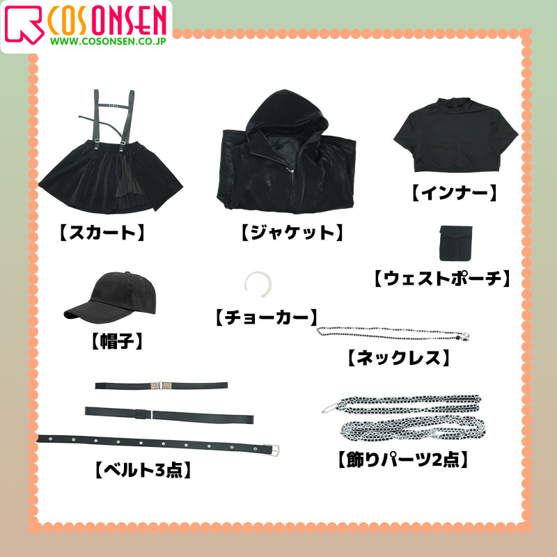 ジャケット、インナー、スカート、飾り物(帽子、チョーカー、ネックレス、ウェストポーチ、ベルト3点、飾りパーツ2点)