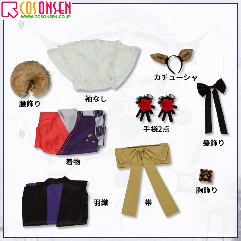 羽織、袖なし、着物、飾り物(カチューシャ、髪飾り、胸飾り、帯、腰飾り、手袋2点)