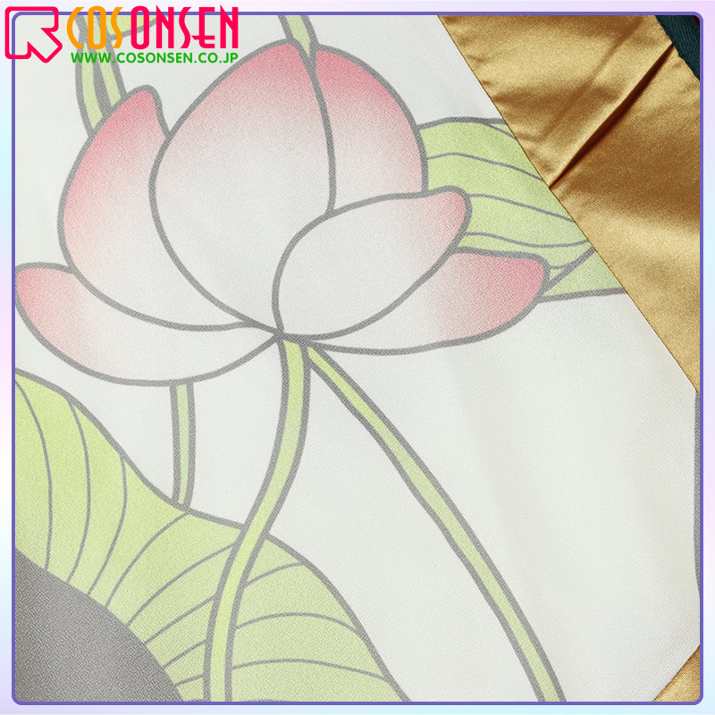 シフォンとポリエステルギャバで製作しています。緑を基調として、蓮の絵柄がプリントされてとても華やかです。