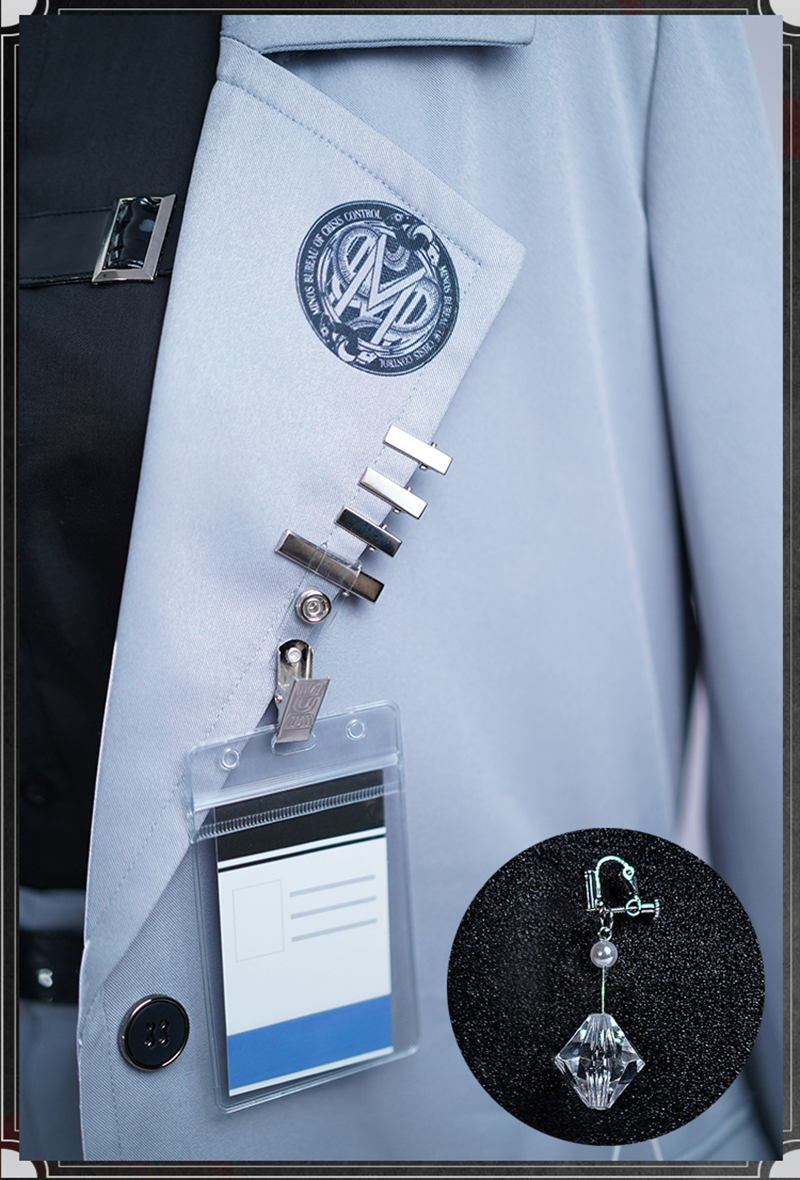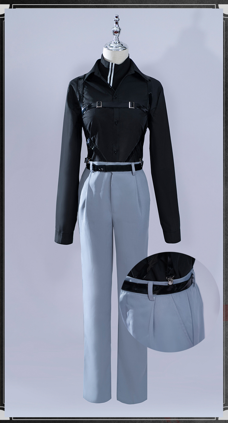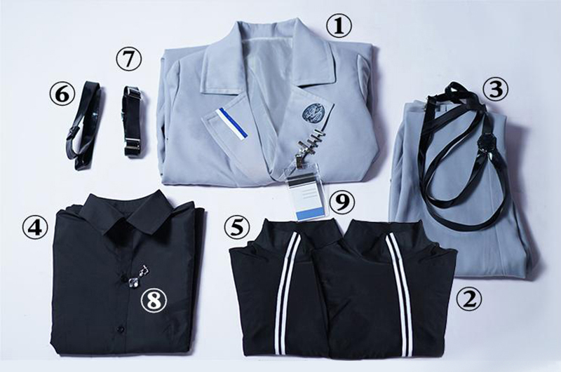 コート、シャツ、インナー、パンツ、飾り物(耳飾り、ベルト3点、名札)