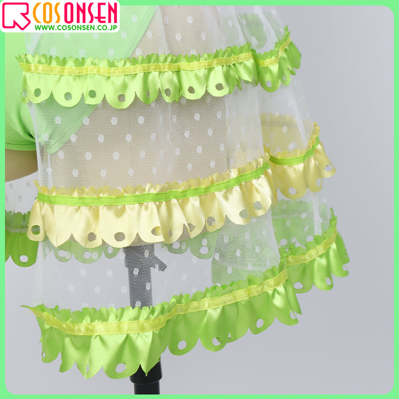 サテンとオーガンジーで製作しています。フリルがあしらわれたワンピースです。ウェスト部分は緑色の蝶結びが飾ってあり、超可愛いです。