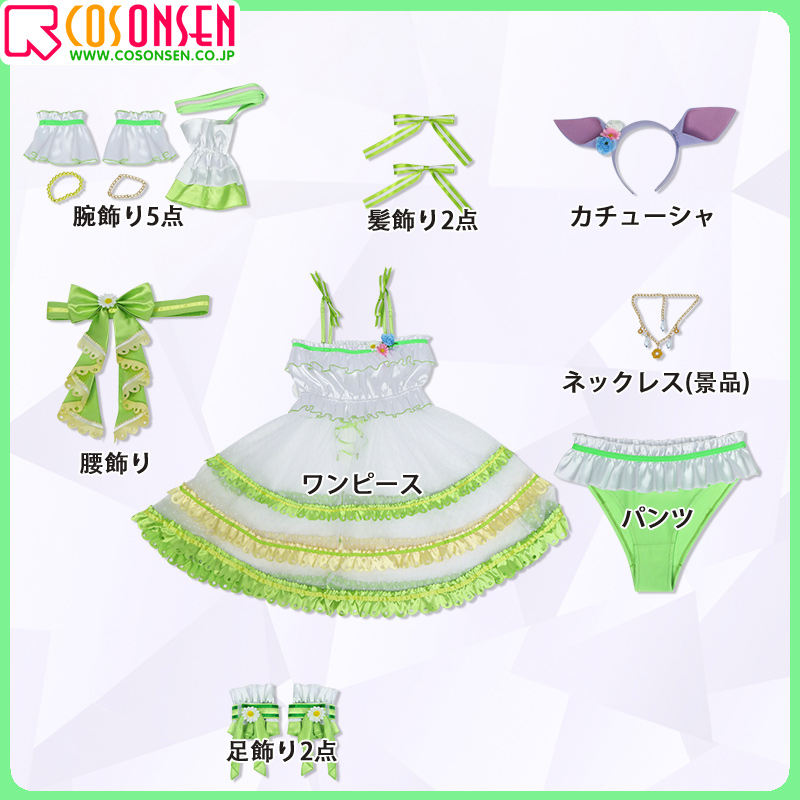 ワンピース、パンツ、飾り物(カチューシャ、髪飾り2点、腕飾り5点、腰飾り、足飾り2点)